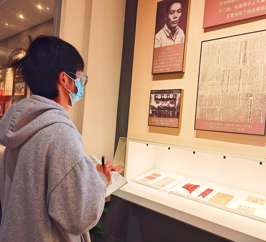 另外,在毛泽东同志新仓经验批示展示馆,党支部成员一入展厅,迎面见到的就是四个大字——“新仓经验”,一旁则是毛泽东同志亲自写下的批示。走进展厅,大量的照片、文献、实物等史实材料与图表、绘画等辅助展品有机结合,全面、切实地展现了平湖县新仓供销合作社和农业生产合作社订立供销结合合同的历史背景、平湖供销合作事业的发展,展示了供销合作社从统购统销到改革开放,从计划经济到社会主义市场经济的的发展过程。党支部成员在展板前驻足停留,认真观看学习,受益匪浅,党支部成员了解到在新中国成立初期,在走合作化道路的历史洪流中,平湖县积极相应中共中央的号召,为发展农业生产、改善农民生活发挥了不可替代的作用。