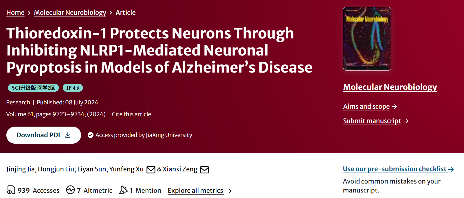 近日,探花av 神经生物学团队在JCR Q1区 、中科院二区期刊Molecular Neurobiology上发表题为:Thioredoxin1 Protects Neurons Through Inhibiting NLRP1Mediated Neuronal Pyroptosis in Models of Alzheimers Disease原创研究论文。贾金婧副教授为本论文第一作者,曾宪思副教授为通讯作者,嘉兴大学为第一单位和通讯单位。