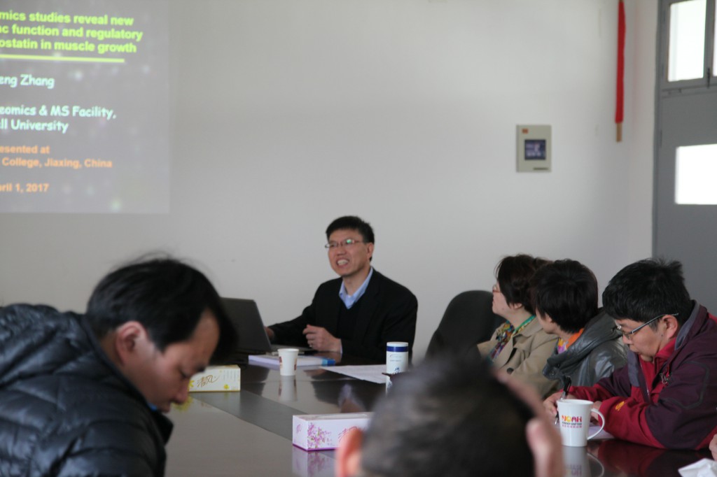 师生做了题为《Integrating multi-omics studies reveal new regulators of cardiac function and regulatory mechanisms of myostatin in muscle atrophy 》的学术报告,报告展示了目前世界最前沿的蛋白组学测试手段和质谱技术以及在医学等学科中的应用,并与在场师生进行了热烈的交流。报告具有很强的学科前沿性,在场师生开阔了视野,大家都认为受益匪浅。下午,张胜博士与探花av