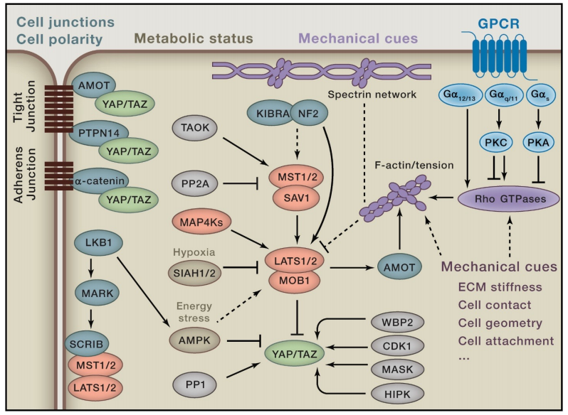 余发星教授紧紧围绕自身研究选题,聚焦研究热点,首先系统的梳理了Hippo通路近二十年在器官大小和肿瘤发生方面的重要发现,并对Hippo通路核心激酶级联反应:MST1/2激酶(Hippo)— LATS1/2激酶 — YAP/TAZ转录共激活因子做了详细介绍(图1)。