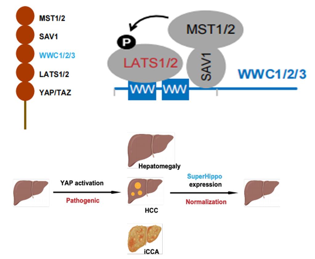 随后余教授详细介绍了WWC蛋白家族(WWC1/2/3)在MST1/2激活LATS/2过程中的重要功能及分子机制,并基于此机制开发了SuperHippo迷你基因,后者能够特异性激活LATS1/2并显著抑制多种肿瘤的发生(图2),该研究在基础及转化研究层面推动了Hippo领域的发展。