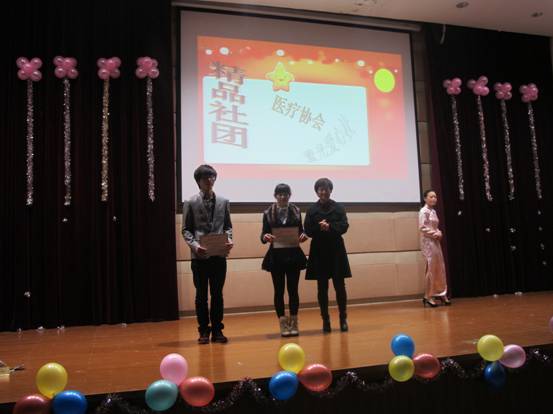 优美的古典舞,刚劲的太极拳及十佳歌手的歌曲串烧之后,团总支书记赵丽萍老师为街舞社、英语协会、国标协会和书画协会4个优秀社团颁发奖状。各优秀社团也为同学们介绍了各自社团的成长历程。英语协会的《新白娘子传奇》俘获了不少同学们的心,优雅的国标舞《独角戏》则让观众目瞪口呆。之后,由学工办杨玲飞老师为“爱之星”手语社和兰心惠质协会颁发最佳社长风采奖。又一轮精彩节目后,党总支副书记谢宏老师为医疗协会和荧光爱心社颁发了今晚的精品社团奖。本次晚会以赏心悦目的《青花瓷》扇子舞和脍炙人口的越剧表演《十八相送》走向尾声。