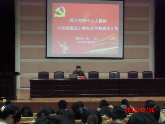 党总支书记张杰老师宣讲以《领会党的十八大精神,为全面建成小康社会贡献聪明才智》为主题的讲座。学院团学干部、各班班团干部、全体学生党员以及2011-2012学年第二学期评奖评优各类获奖代表参加。