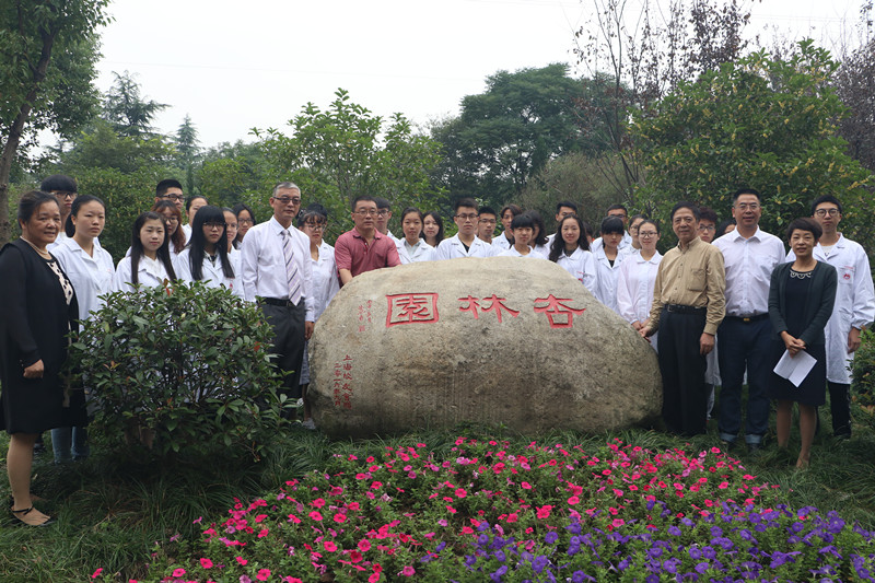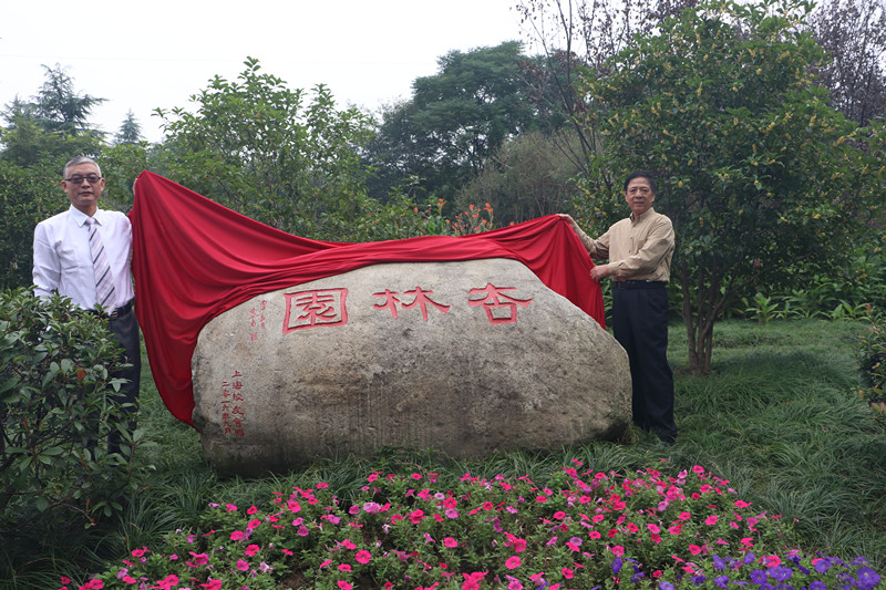 在大家的共同见证下,惠太望书记和校友代表陈渊一起为“杏林园”石揭幕。