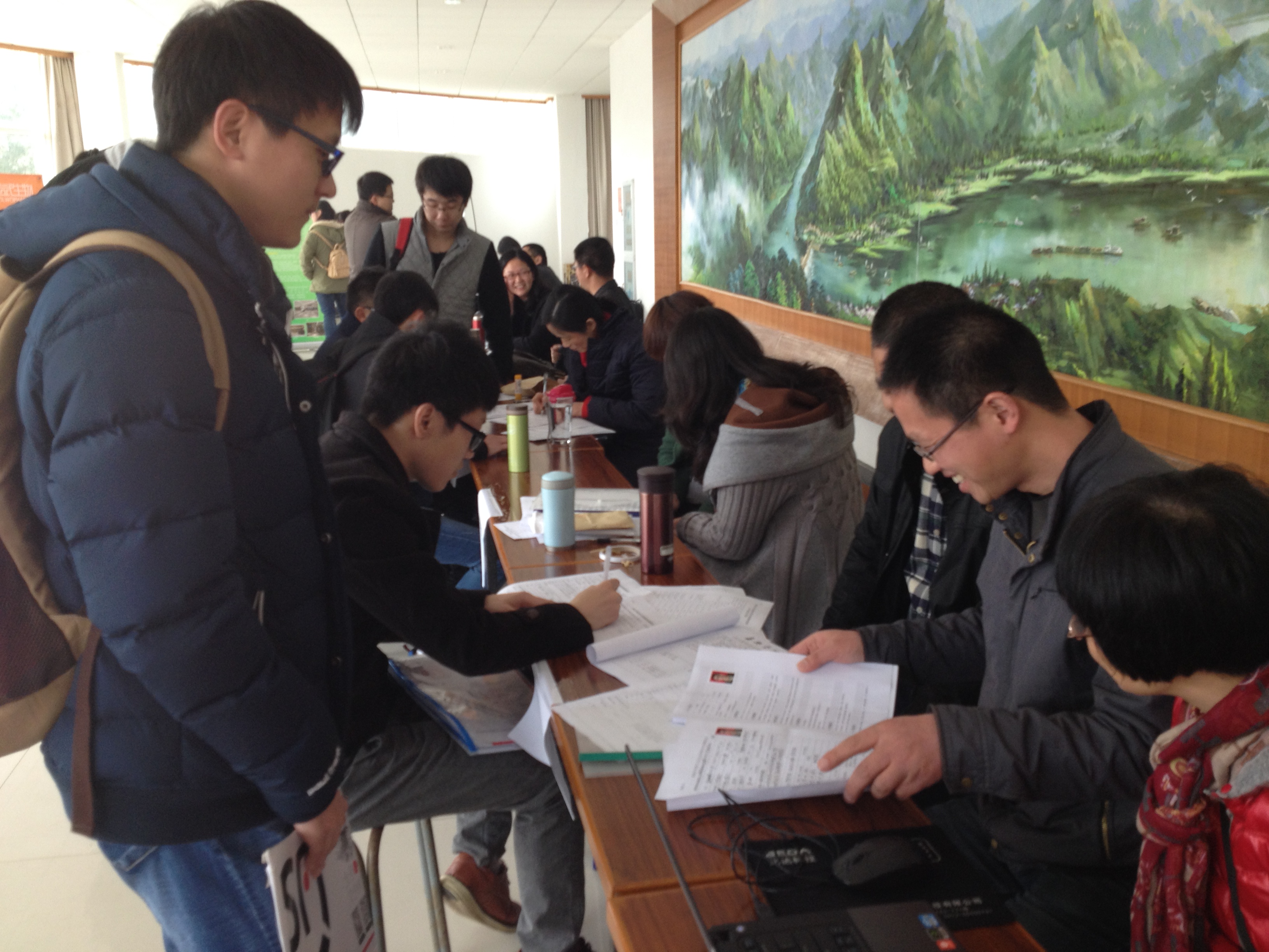 招聘会定于上午9:30开始,但是上午九点刚过,就陆陆续续有学生来现场咨询,并当场报名上交简历,其中,报名平湖市卫生局的同学,下午就直接进行面试。招聘现场用人单位和同学们之间进行了各种交流,可谓是一片热闹非凡。
