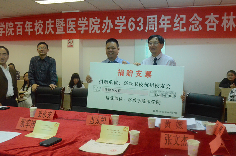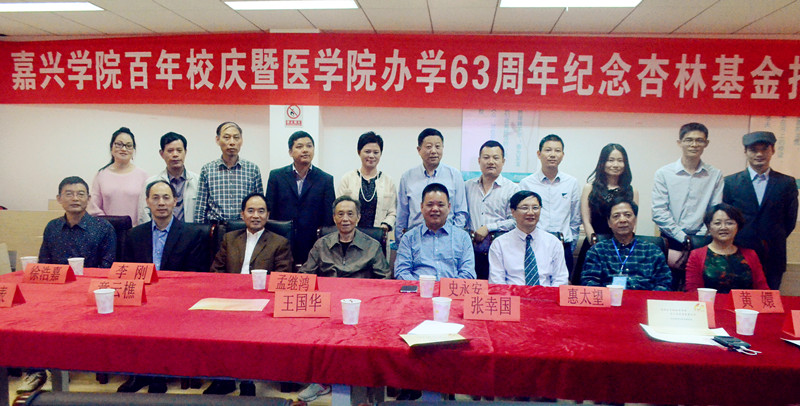 2014年10月17日14:30,嘉兴学院百年校庆暨探花av 办学63周年纪念杏林基金捐赠仪式在探花av 实验中心601示教室隆重开幕。校党委副书记史永安老师,探花av 院长孟继鸿老师,探花av 党委书记惠太望老师,副院长黄嬛老师,探花av 各位优秀校友及部分在校师生一起见证了本次杏林基金捐赠仪式。