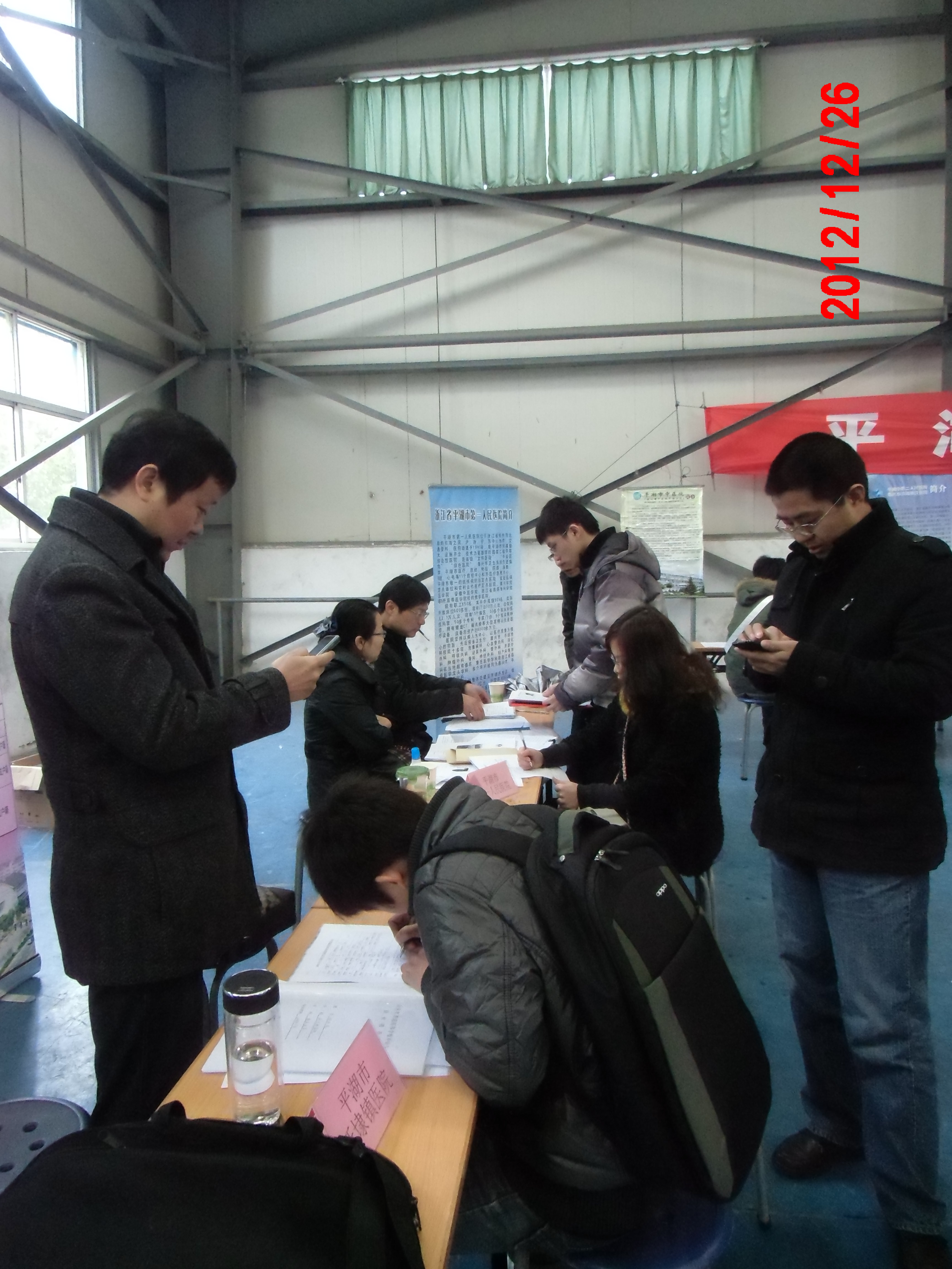 招聘现场同学们也主动向用人单位提交个人简历和报名表,招聘方热情地为同学们介绍本单位情况。下午,海宁市、平湖市卫生局和人事局分别组织报考同学在1号楼进行统一面试。