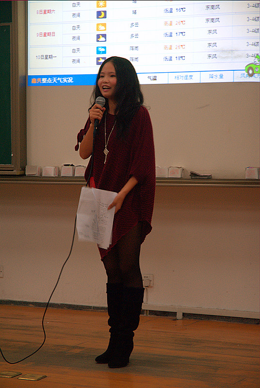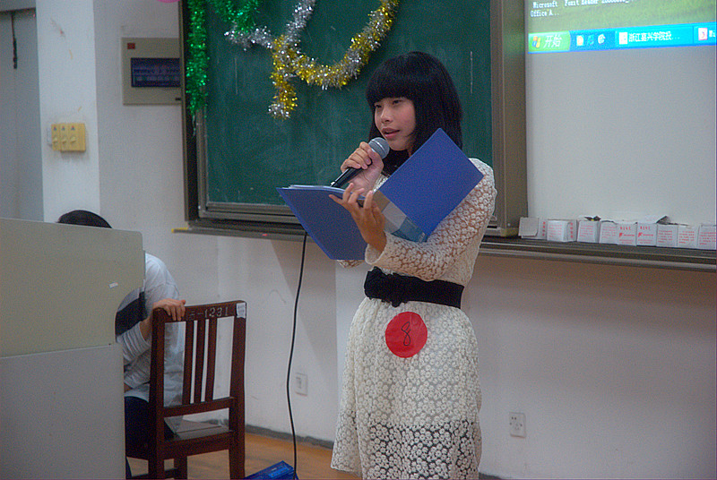 在教四223举行了2011级新生主持人大赛。共有11名11届新生参加。评委由团总支书记赵丽萍,学工办老师彭溶和杨玲飞,学生会主席杜侠莹及嘉宾评委许建芳等担任。