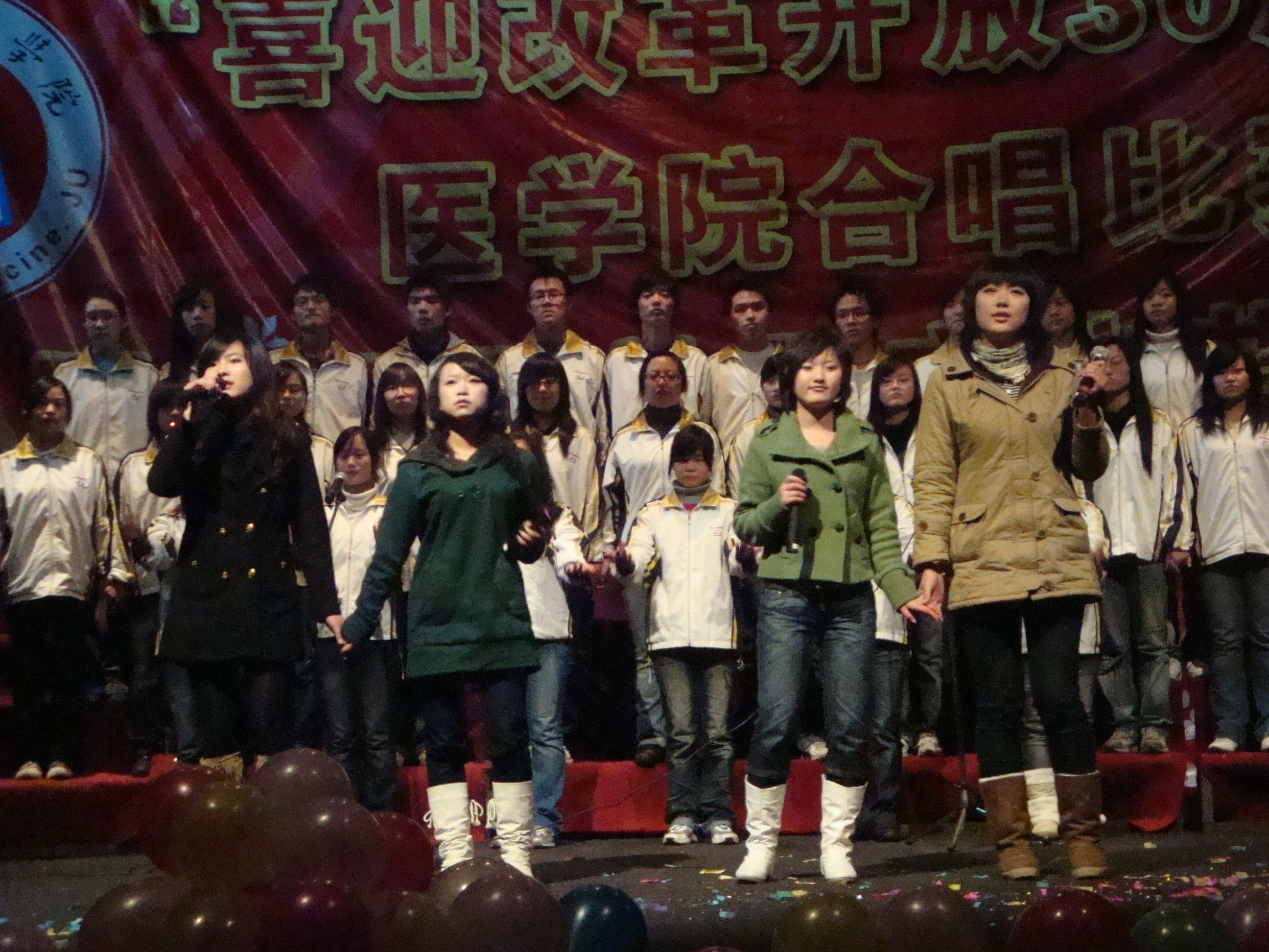 参加合唱比赛决赛的十四个班级在主持人报幕后先后登场,各班的节目精彩纷呈,来自护本071的《歌唱祖国》、护本072的《明天会更好》歌咏了我国改革开放带来的繁荣景象,医本072的《我的中国心》、医本081的《爱因为在心中》、医本082的《精忠报国》、医本N074的《大海啊故乡》分别抒发了大学生们对祖国的热爱之情,医本N075的《新青年制造》、医本N081的《年轻的战场》、护本081的《唱的响亮》均展现了大学生的青春风采。其中还穿插了动感的健美操、优美的笛箫吹奏、精彩的武术和激动人心的街舞表演。演出现场的掌声和呼喊声此起彼伏,将晚会的气氛推向高潮。