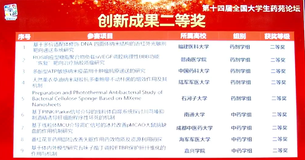 药学20级李驰同学团队(指导老师:吴霁蓂/高广春)获创新成果二等奖,药学20级贾雨琪同学团队(指导老师:刘石惠/黄越燕)获创新成果三等奖,参赛学生们在比赛中充分展现了我校学生优良的精神风貌与综合素质。