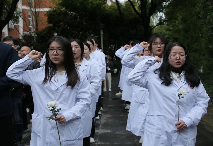 学生代表在无语良师碑前庄严宣誓,铮铮誓言表达了广大医学生“除人类之病痛,助健康之完美”的初心和使命,激励着嘉医学子们不断攀登医学高峰,造福人民生命健康。