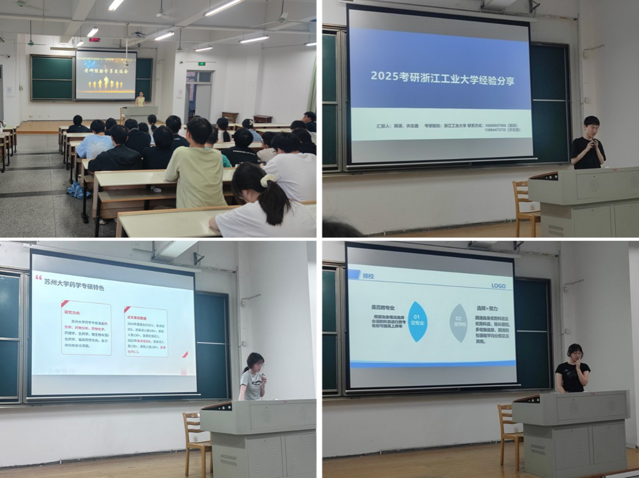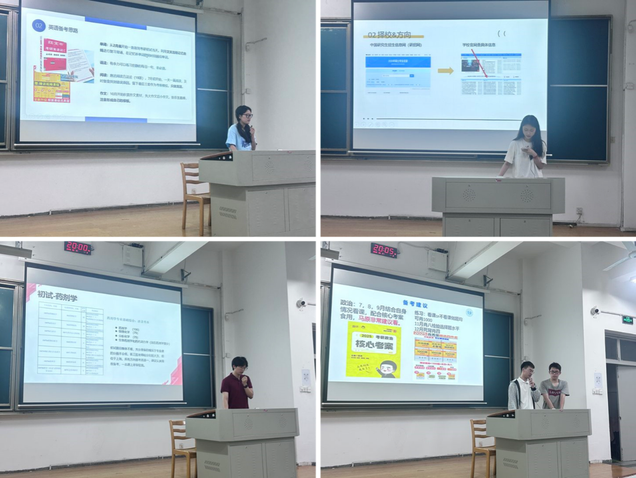 活动伊始,主持人简要介绍了本次交流会的流程与目的,拉开了这场知识盛宴的帷幕。在经验分享环节,20位考研成功的2025届药学毕业生依次登台,倾囊相授自己的“考研秘籍”。有同学着重分享了院校专业选择的窍门,建议同学们综合兴趣、就业前景、自身实力等因素,精准定位目标;有同学分享了如何从零基础攻克陌生专业课程的方法,强调构建知识框架、多做真题的重要性;也有同学围绕心态调整展开,讲述在备考压力下,通过运动、听音乐等方式缓解焦虑,保持积极乐观心态的经验。