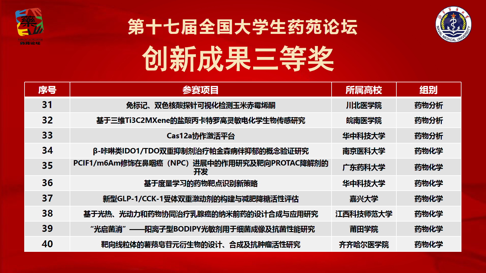 2025年10月18日,由全国大学生药苑论坛组委会主办、海军军医大学承办的第十七届“全国大学生药苑论坛”决赛圆满落幕。我院参赛项目荣获创新成果三等奖1项。
