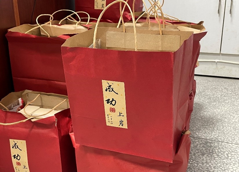 一份份满载心意的“暖心礼包”被送到同学们手中:寓意“成功上岸”的牛奶、及时补充能量的士力架、象征“笔下生辉”的考试专用文具……细微之处,尽显温暖与牵挂。