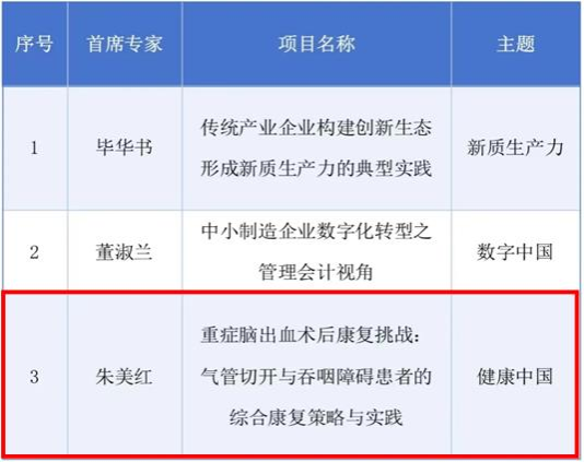 共有3个项目入选,涵盖“新质生产力”“数字中国”“健康中国”三大主题,其中我院护理学专业研究生导师朱美红老师主题案例《重症脑出血术后康复挑战:气管切开与吞咽障碍患者的综合康复策略与实践》成功入选“健康中国”方向。
