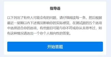 1、本次测量只是了解您近期的心理状态,每道题的答案无所谓对错。在测试过程中,不用过多考虑应该怎样,也不要与他人商量讨论,只需根据自己的真实情况凭第一感觉回答即可。学校会对您的测试结果保密。